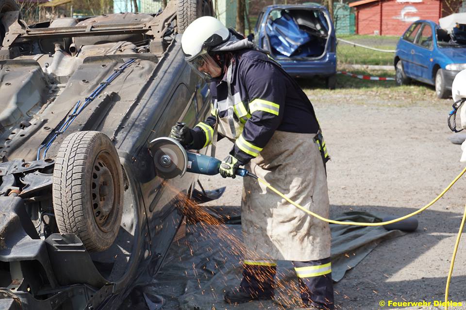 Der erste Ausbildungsabschnitt befasste sich mit der Rettung einer Person, die unter einem PKW eingeklemmt war. Im zweiten Szenario mussten insgesamt 3 eingeklemmte Personen aus verunfallten Fahrzeugen gerettet werden. Nach kurzer Mittagspause und Auswertung ging es weiter mit der Rettung verletzter Personen aus überschlagenen oder auf der Seite liegenden Fahrzeugen.